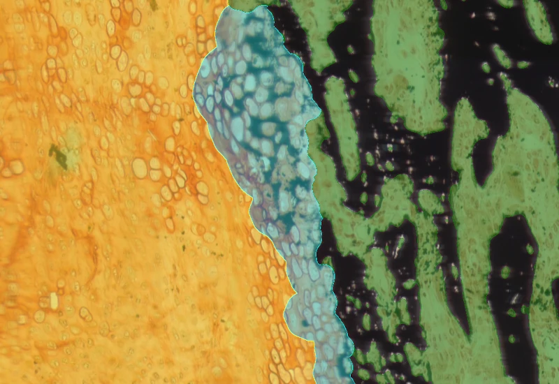 The Bone Mineralisation APP provides separation of ‘Safranin O’ stained bone tissue into the morphological substructures including cartilage, mineralized cartilage bone marrow and mineralized bone. Measurements assessed with this APP such as TV, BV, MCV (mineralized cartilage) CV (cartilage volume), bone marrow (BM).