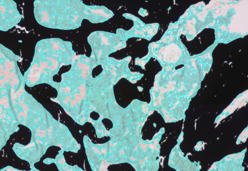 Detect mineralized bone and osteoid in Goldner-stained sections and measure BV, TV, OV, OV/BV, OV/TV, OS, BS, mean osteoid width, and mean osteoid thickness.