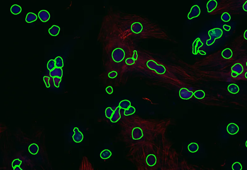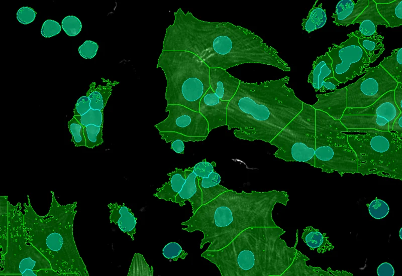 Detect nuclei and identify cardiomyocytes in IF-stained cell cultures, reconstruct cytoplasmic masks, and quantify cardiomyocyte number, area, and marker intensity.