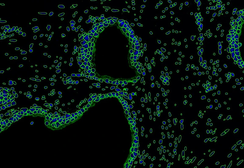 Analyze single-cell co-expression of two IF markers, segment cells into nucleus, perinuclear area, and/or cytoplasm, and export up to 20 intensity, statistic, and morphometric parameters.
