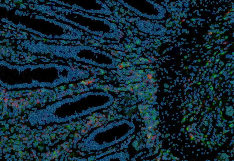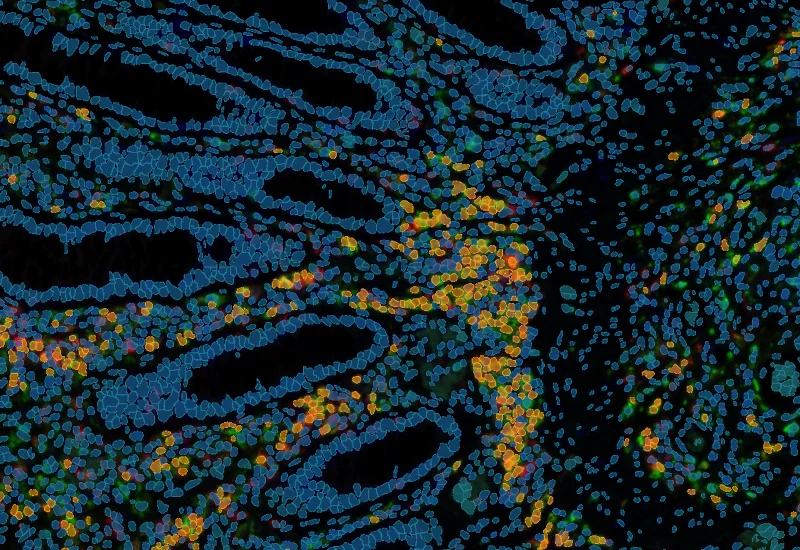 Determine phenotypes of specific IF-stained cell populations, analyze spatial relationships to neighboring cells and metastructures (e.g. vessels, tumors), and perform proximity and infiltration analyses.