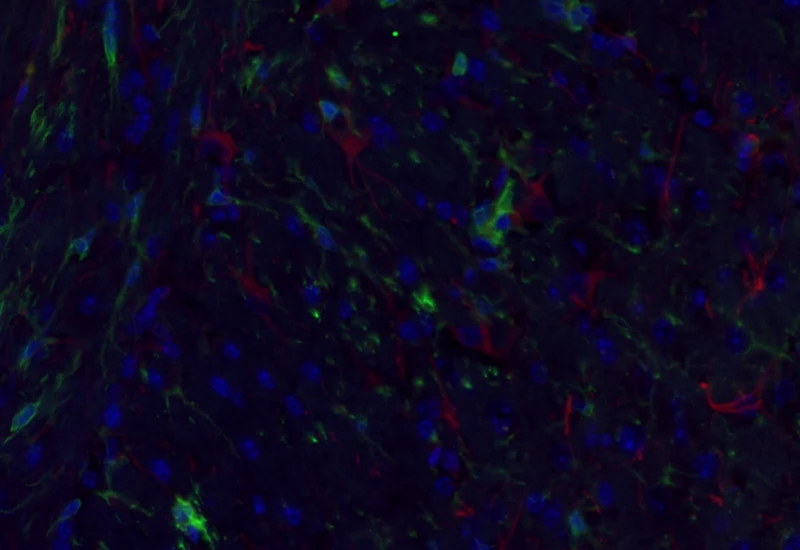 Detect astrocytes and microglia in IF-stained samples and measure cell counts and the number of short and long branches per cell.