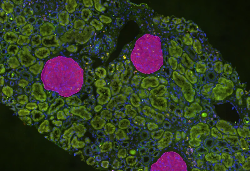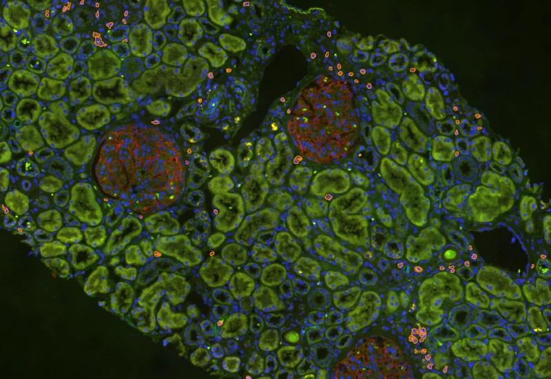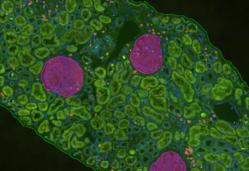 Detect tissue, cells, and marker-stained glomeruli, segment cells into nucleus and/or cytoplasm, define phenotypes of IF-stained populations, classify cells inside or at defined distances from glomeruli.