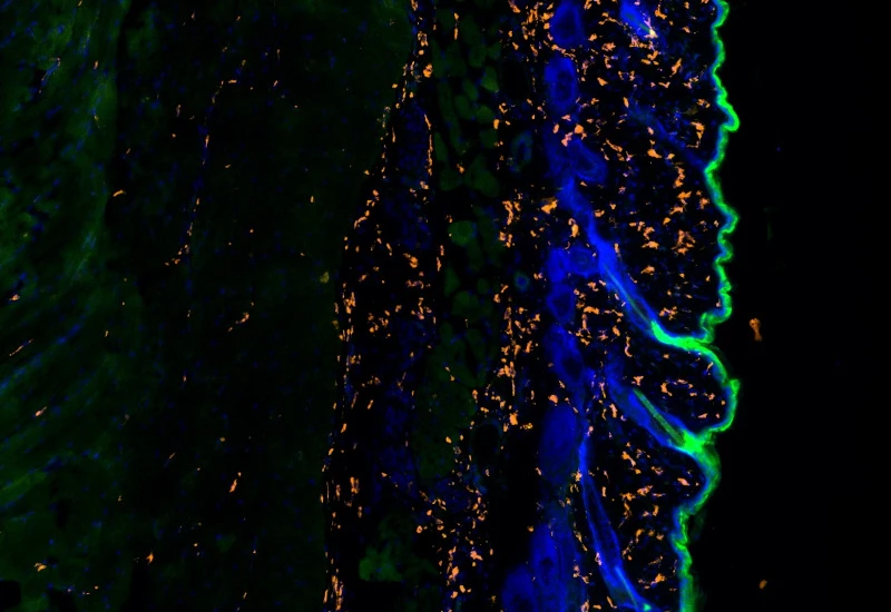 The IF Skin Morphology App provides tissue detection including segmentation into epidermis and dermis based on specific IF staining. It segments the cells into nucleus, and/or perinuclear area and/or cytoplasm and determines the cellular phenotype of specific IF stained cell populations. The detected cells can be classified and visualized as being either within or outside of detected structures (epidermis and dermis). Each segmented cell compartment is measured for up to 20 intensity, statistics and morphometric parameters which can be displayed in diagrams and exported. Image Courtesy: Hosana Rodrigues, State University of Campinas
