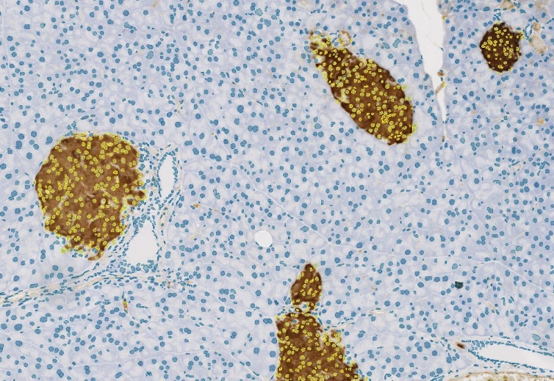 The IHC Insulin Islet App allows for detection of marker stained insulin islets, the whole tissue, and cellular phenotypes stained by specific markers within the insulin islets and in the tissue. The App outputs, whole tissue area (µm2), number and area (µm2) of detected insulin islets. Number of cells and marker-specific phenotypes in the whole tissue as well as within the insulin islets.