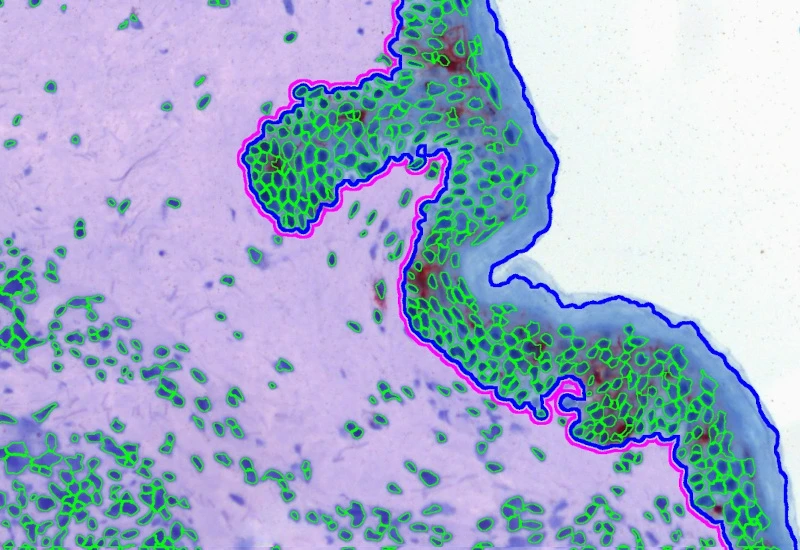 Detect macrophages in IHC samples, apply area and distance-range algorithms to measure Langerhans cell distances to the epidermis border inside/outside, and export up to 20 parameters per cell compartment plus boundary distance.