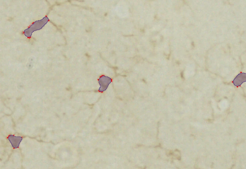 Detect microglia soma in IHC-stained samples, segment branches, and identify primary and secondary branching points to quantify cell morphology and branching complexity.