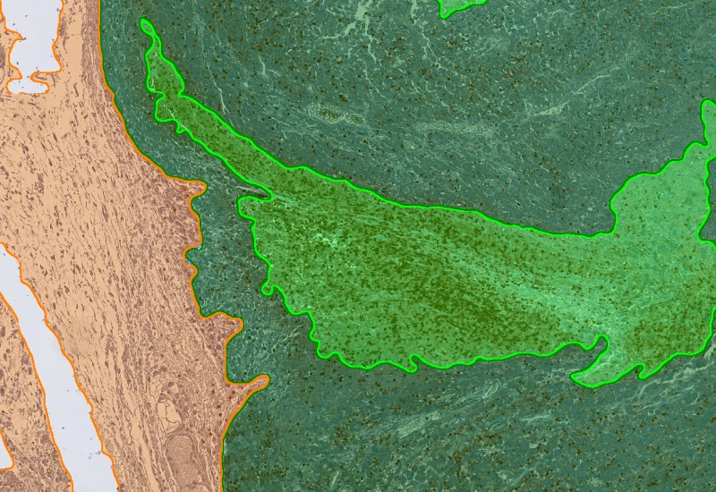The IHC Necrotic Tumor App is able to segment tumor tissues into tumor, necrotic tissue and stroma using the AI Classifier. Furthermore, it identifies single cells as well as one additional cellular marker (e.g. Neutrophils). It outputs area of tumor, necrotic tissue and stroma. Further measurements are the number and percentage of neutrophils within the morphological entities.