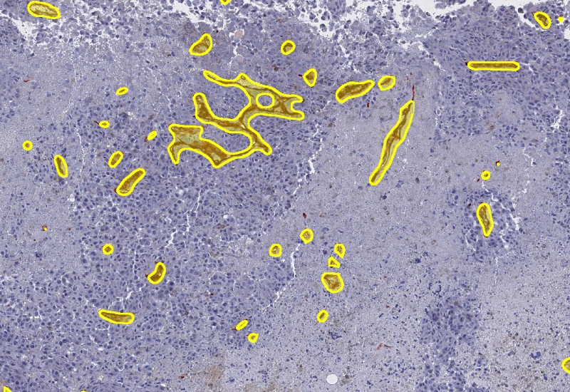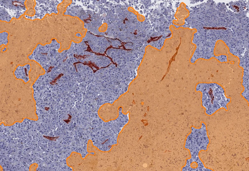 The IHC Necrotic Tumor Angio App is able to segment tumor tissues into tumor, necrotic tissue and blood vessels using the AI Classifier. It outputs area of tumor, necrotic tissue and blood vessels as well as the number and percentage of blood vessels in total and within the two morphological entities.