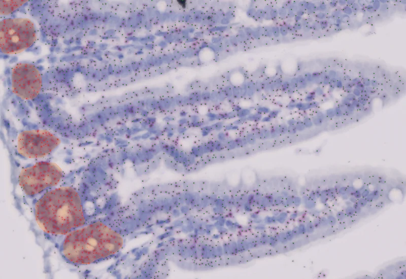 The IHC Small Intestine - Dots App provides nuclei segmentation as well as detection of tissue and villi based on nuclei staining. crypts need to be defined manually. Furthermore it allows the dot detection for one dot markers (CISH, RNAScope, SISH) within villi and crypt area. Dot parameters are provided for villi and crypts and include count, mean intensity, total dot area, and sum of intensity as well as area and intensity lists for all single dots.