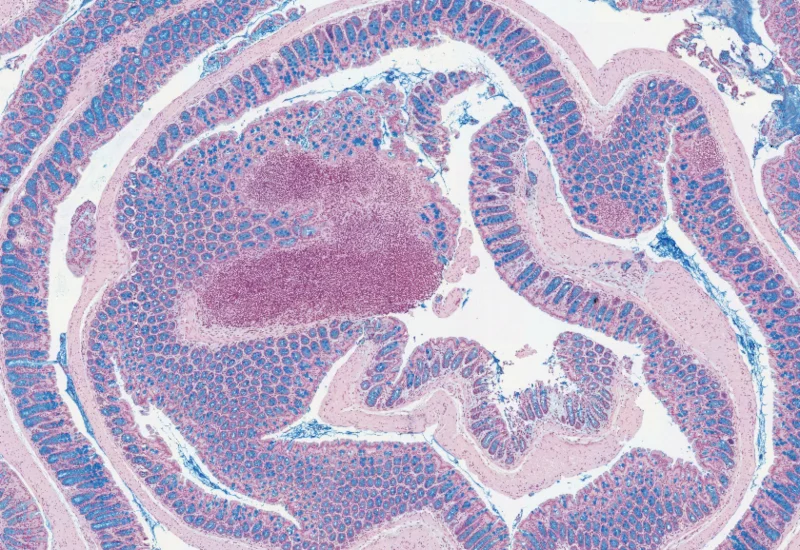 The Mucin Swiss Roll App allows for detection of the swiss roll, and the segmentation into different subclasses (mucosa, immune cell follicles, connective tissue, background). Further it detects nuclei and (e.g. PAS stained) mucin. The App outputs area (µm2) of detected tissues/tissue classes, count of total cells and in each detected area as well as the area of stained mucin in the entire tissue and within the subclasses.