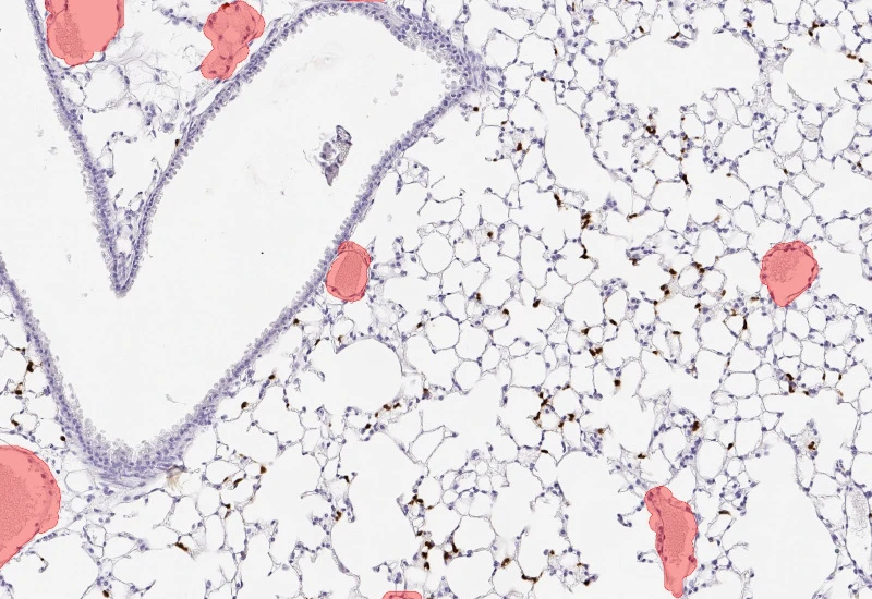 The Pulmo App segments nuclei as well as the metastructure components of lung, including total tissue, bronchioles, blood vessels and alveoles. Further it detects cellular phenotypes within the metastructure components. Each segmented metastructure/nuclei is measured for up to 20 morphometric parameters.