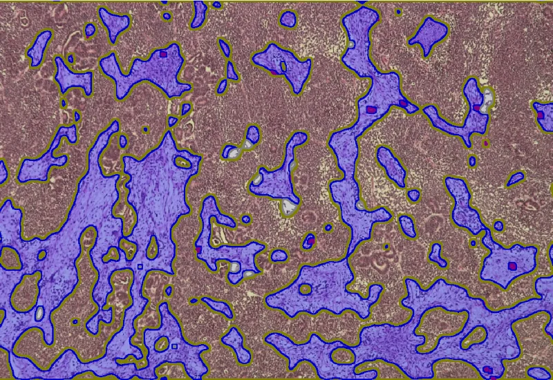 The Wilms Tumor App is based on the AI Classifier and allows the segmentation of H&E stained Willms tumor tissues into tumor, stroma, blood vessels. It outputs the area (µm2) of the segmented tissue entities.