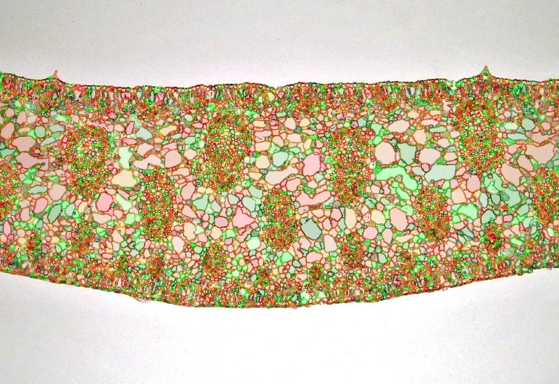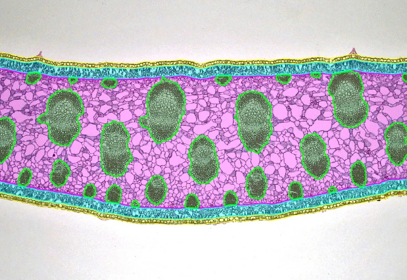 Segment Yucca leaf into epidermis, collenchyma, parenchyma, and vascular bundles; detect cells, classify vascular bundles by size, and quantify substructure areas and spatially defined cell distributions.