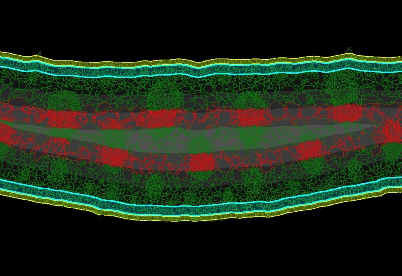 The Yucca Leaf App separates the Yucca leaf into the following anatomical substructures: epidermis, collenchyma, parenchyma, and vascular bundles. Furthermore, it detects individual plant cells and allows for the spatial identification of cells within user-defined proximities to any anatomical structure. In addition, it categorizes the identified vascular bundles into different size ranges. The output includes the area of each anatomical substructure, the number of cells within each substructure, the number of identified cells in spatial context, and the number of vascular bundles in each size category.