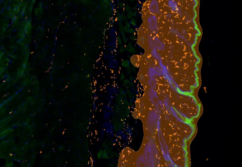Characterize immune cell phenotypes relative to detected metastructures (e.g. tumors, glands), define distance ranges, measure cell-to-boundary distances inside/outside, and export up to 20 intensity, statistic, and morphometric parameters per cell compartment.