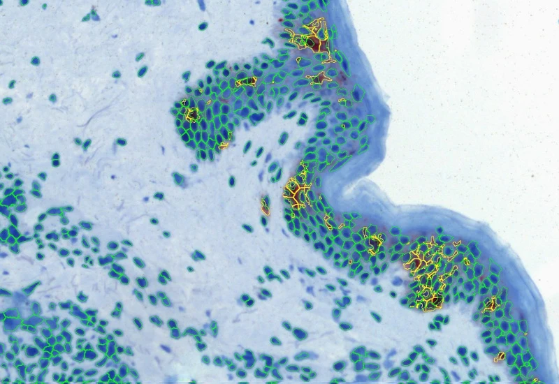 Detect macrophages in IHC samples, apply area and distance-range algorithms to measure Langerhans cell distances to the epidermis border inside/outside, and export up to 20 parameters per cell compartment plus boundary distance.