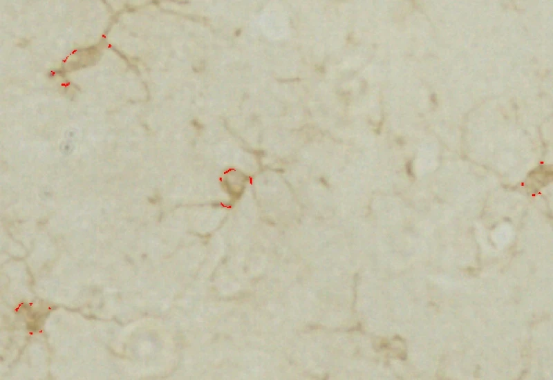 Detect microglia soma in IHC-stained samples, segment branches, and identify primary and secondary branching points to quantify cell morphology and branching complexity.