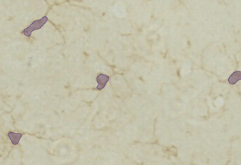 The IHC Microglia App detects microglia soma based on a specifc staining and further identifies branches as well as primary and secondary branching points. It outputs number and area of cells, number of primary and secondary branching points as well as area and lenght of the detected branches.