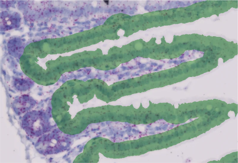 The IHC Small Intestine - Dots App provides nuclei segmentation as well as detection of tissue and villi based on nuclei staining. crypts need to be defined manually. Furthermore it allows the dot detection for one dot markers (CISH, RNAScope, SISH) within villi and crypt area. Dot parameters are provided for villi and crypts and include count, mean intensity, total dot area, and sum of intensity as well as area and intensity lists for all single dots.