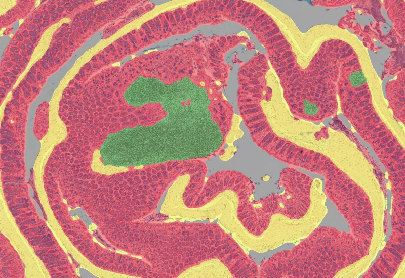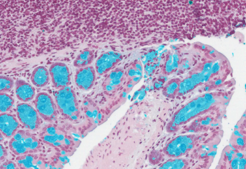 The Mucin Swiss Roll App allows for detection of the swiss roll, and the segmentation into different subclasses (mucosa, immune cell follicles, connective tissue, background). Further it detects nuclei and (e.g. PAS stained) mucin. The App outputs area (µm2) of detected tissues/tissue classes, count of total cells and in each detected area as well as the area of stained mucin in the entire tissue and within the subclasses.