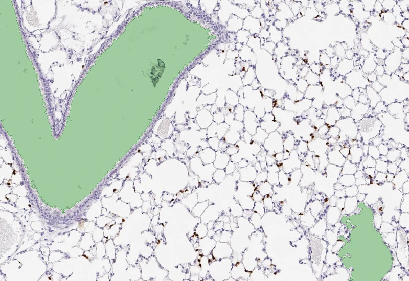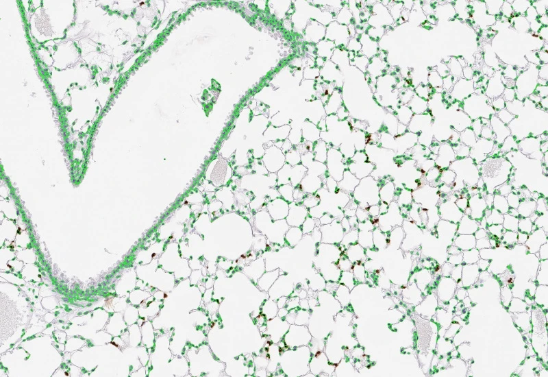 Segment nuclei and lung metastructures (total tissue, bronchioles, vessels, alveoli), detect cellular phenotypes within each component, and measure up to 20 morphometric parameters per metastructure and nucleus.