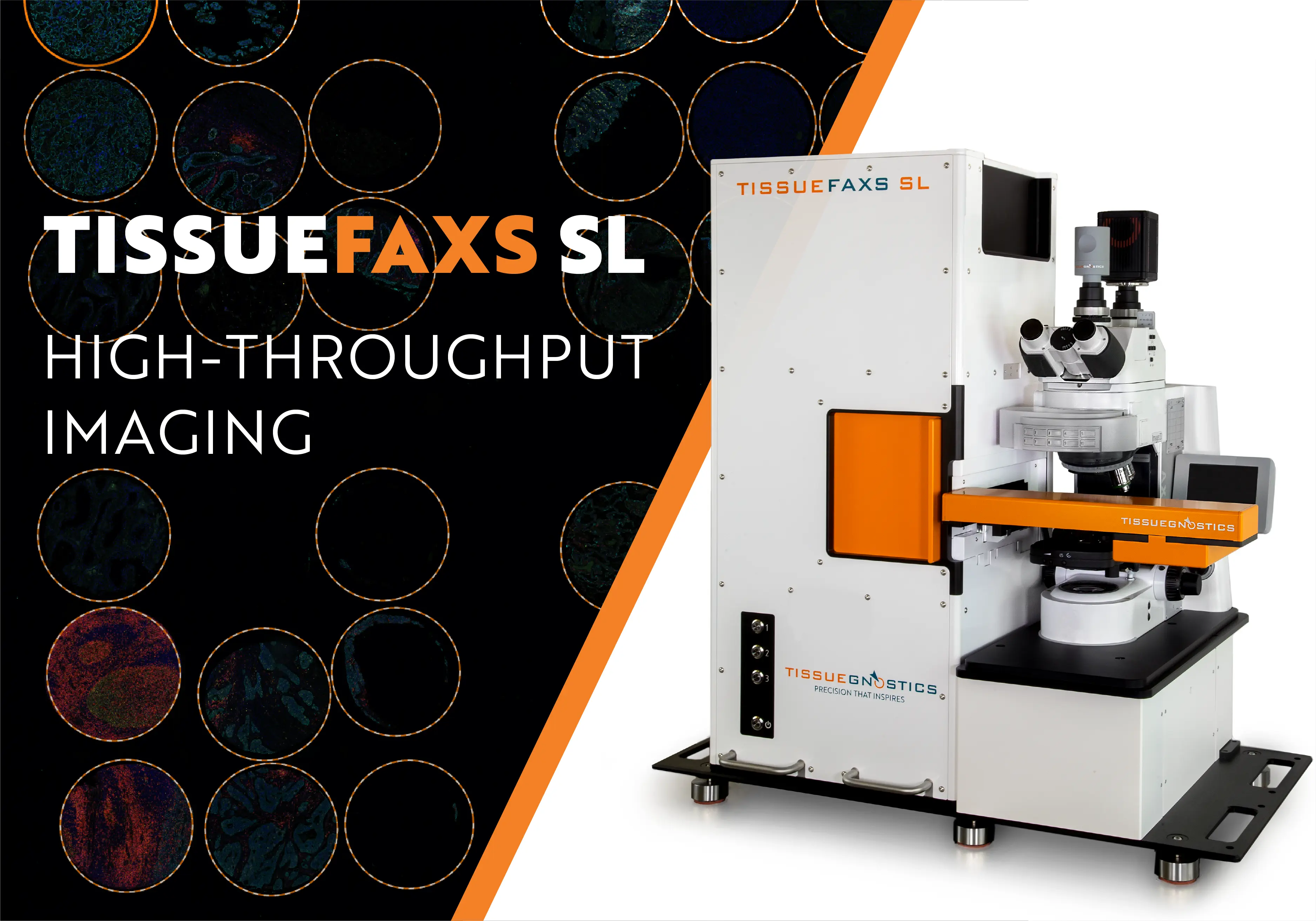 TissueFAXS Slide Loader is a versatile high-throughput system capable of imaging up to 120 standard slides or 60 double-sized slides in mixed modes, brightfield and fluorescence. Need to image thicker samples? An additional confocal unit will provide a crisp whole-slide image. Plan a multiplex staining workflow? Multispectral configuration can image up to 8 markers in a single run without channel bleed-through. Thanks to the system flexibility, your TissueFAXS system can grow with your lab.