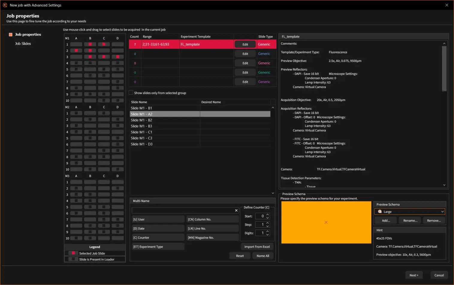 Slide names can be customized manually or imported in bulk from an Excel spreadsheet file, making it easy to maintain consistent sample tracking across large batches.