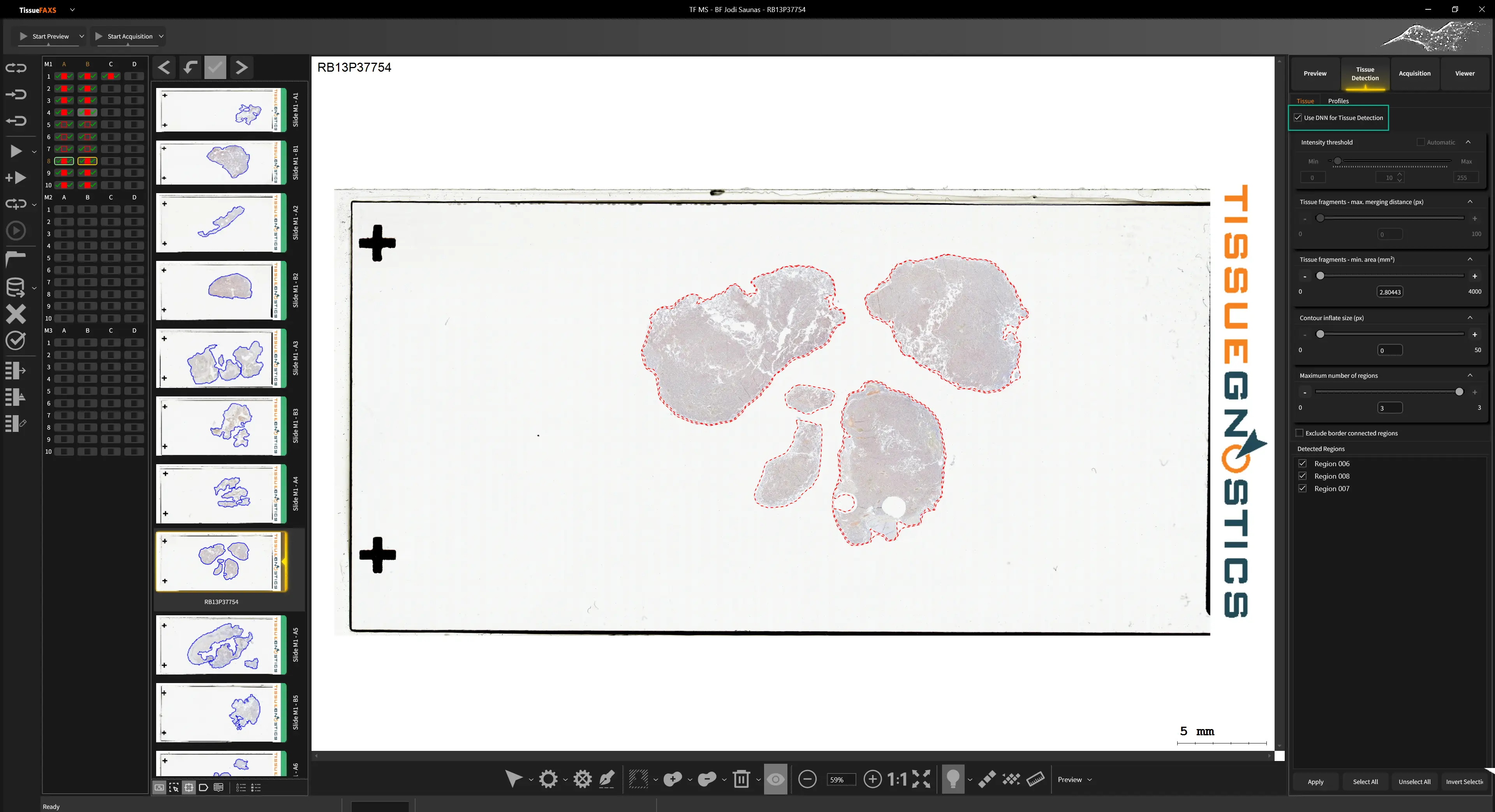 Validate or adjust tissue detection, preview and/or optimize focus points, and validate regions before or during acquisition - without stopping the batch. The system supports automated or manual review of preview images, and field of view-specific reacquisition is available for refining results. Slide validation status is visible at a glance, making quality control seamless even across high-volume runs.